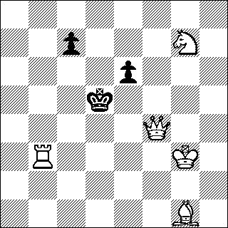 W:Kg3,Df4,Tb3,Lg1,Sg7 S:Kd5,Bc7,Be6 (5+3) Matt in 2 Zügen |